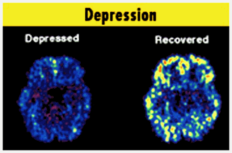 Die folgende Grafik einer funktionellen Kernspin-Aufnahme, vom US-National Institute of Mental Health in Bethesda, Maryland, USA, zeigt das Gehirn einer an Depression erkrankten Frau, vor und vier Wochen nach ihrer medikamentösen Behandlung mit einem Serotonin-Wiederaufnahmehemmer. Der rechte Teil der Grafik zeigt deutlich wesentlich stärkere Aktivitätsmuster, ganz besonders in ihrem linken Stirnlappen,