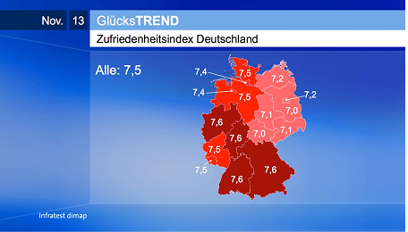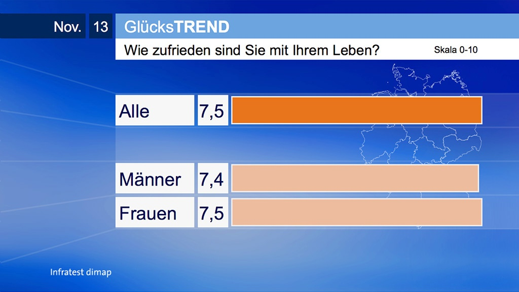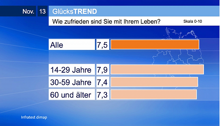 Nach dem sechsmonatigen Befragungszeitraum steht fest: Die Deutschen sind mit einem Mittelwert von 7,5 überwiegend zufrieden – Frauen mit einem Wert von 7,5 etwas mehr als die Männer mit 7,4."