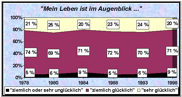 1998 zeigt, dass das Glück sehr leicht abnahm. Um die 70 Prozent sagten – in wirtschaftlich ganz unterschiedlichen Zeiten –, dass sie „ziemlich glücklich“ und um die 20 Prozent (oder jeder