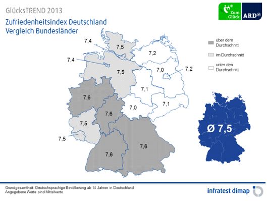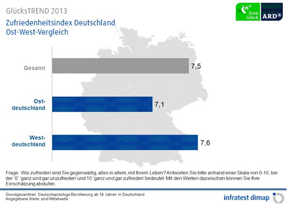 Die Kernaussage für die Westdeutschen ist, dass ihr Glück, abgesehen von kleinen Schwankungen, in allen EU- und weltweiten Umfrage-Vergleichen mittelmäßig hoch